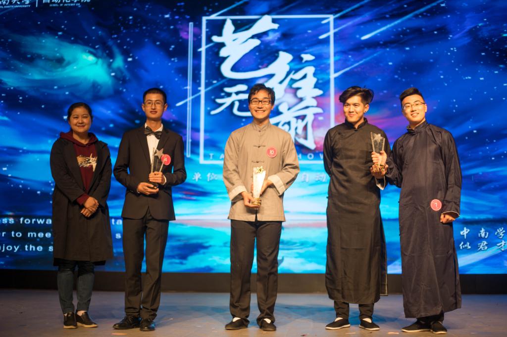 整场比赛台上台下互动良多,礼堂里洋溢着自动化学子的热情与活力。经过激烈角逐,研究生李德昀以其惊艳的京胡独奏《夜深沉》获得冠军,相声《艺术人生》的表演者孔祥煜、王家振获得亚军,练习钢琴十四年的茅艇峰获得季军,成人小说党委黄亚副书记为他们颁奖并合影。