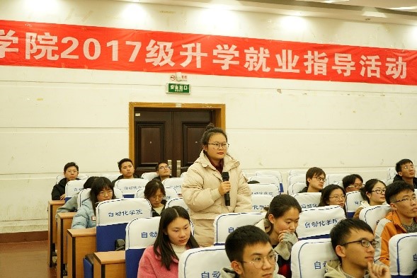 经验分享之后是交流提问环节,2017级同学们结合聆听体会和自身情况积极提问,提出了“通过校外培训机构找工作是否靠谱?”“搜集实习信息都有哪些渠道?”“未来不想从事专业技术岗,应如何处理学习与求职准备的关系?”等问题,2016级学长们悉心听取,逐一解答,对学弟学妹们的困惑给出了合理建议。