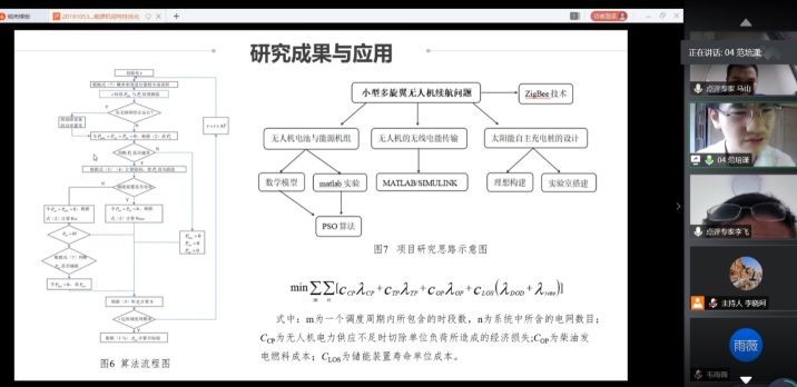 在第八会场中,范培潇同学负责的项目成果显著,深受大家喜爱。“基于PSO算法的无人机续航系统的能源机组特性优化”项目致力于研究无人机能源机组的优化,进而提升其续航能力,提高无人机的工作效率,从而使无人机运用到更加广阔的领域中。